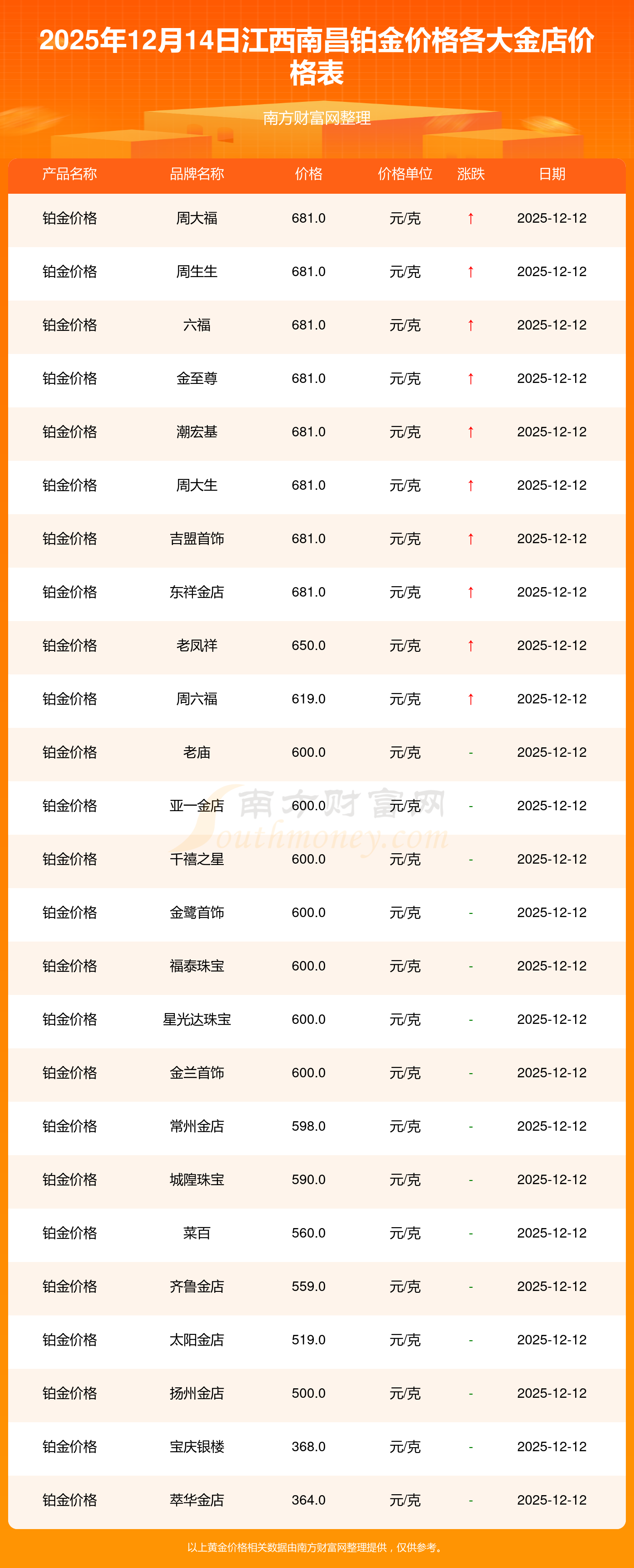 今天是2025年12月14日,江西南昌周大福、周大福、老凤祥、老凤祥、老庙、老庙、周生生、周生生、周大福、周大福、周大福等各大金店品牌铂金价格最新价格行情是这样的:周大福1336.0元/克、周大福681.0元/克、老凤祥1337.0元/克、老凤祥650.0元/克、老庙1339.0元/克、老庙600.0元/克、周生生1338.0元/克、周生生681.0元/克、周大福1336.0元/克、周大福47410.0、周大福19550.0。