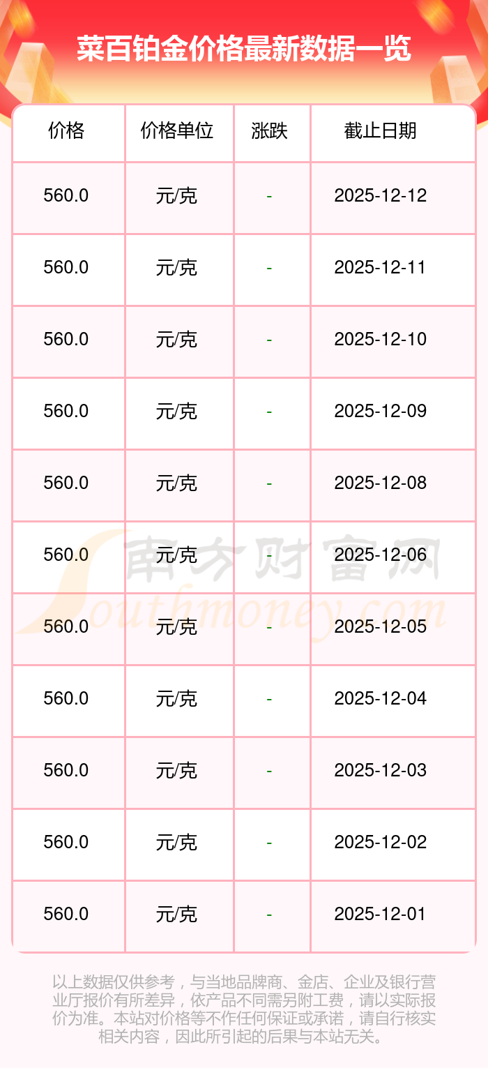 今日菜百 铂金价格最新的克重售价为560.0元/克。