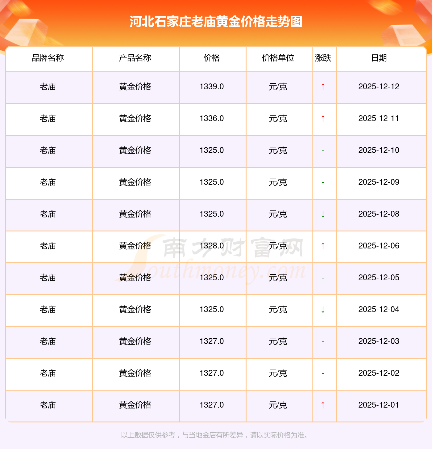 今日河北石家庄老庙黄金价格公布今日每克黄金在零售市场的价格是多少1339.0元/克的黄金价格,是河北石家庄老庙在 2025年12月14日给出的。