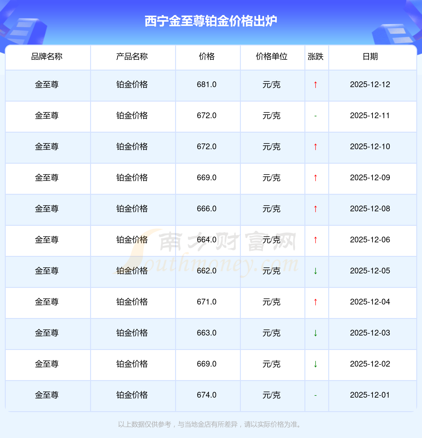今日西宁金至尊铂金价格最新价格是681.0元/克。