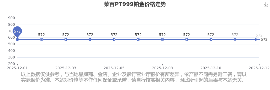 今日菜百所公布的 PT999铂金最新价格为572.0元/克。