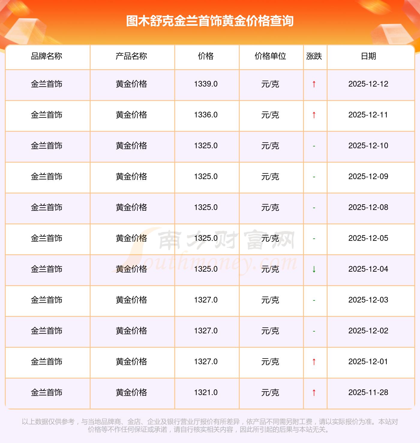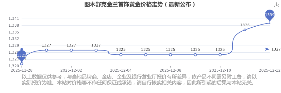 今日(2025年12月14日),图木舒克金兰首饰黄金价格的定价为 1339.0元/克。
