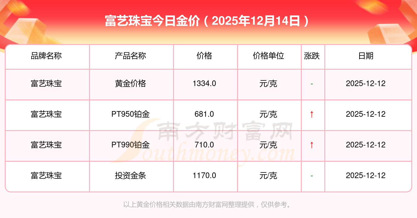 2025年12月14日各大金店PT990铂金最新价格:周大福1336.0元/克,周大福681.0元/克,老凤祥1337.0元/克,老凤祥650.0元/克,老庙1339.0元/克,老庙600.0元/克,周生生1338.0元/克,周生生681.0元/克,周大福1336.0元/克,周大福47410.0,周大福19550.0。