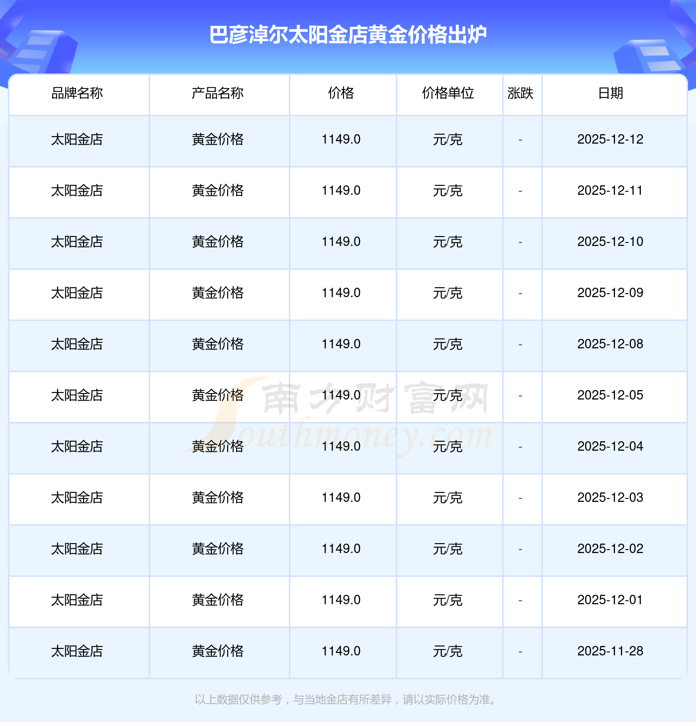 今日巴彦淖尔太阳金店黄金价格公布黄金每克价值多少钱(2025年12月14日)今日巴彦淖尔太阳金店黄金价格是1149.0元/克。