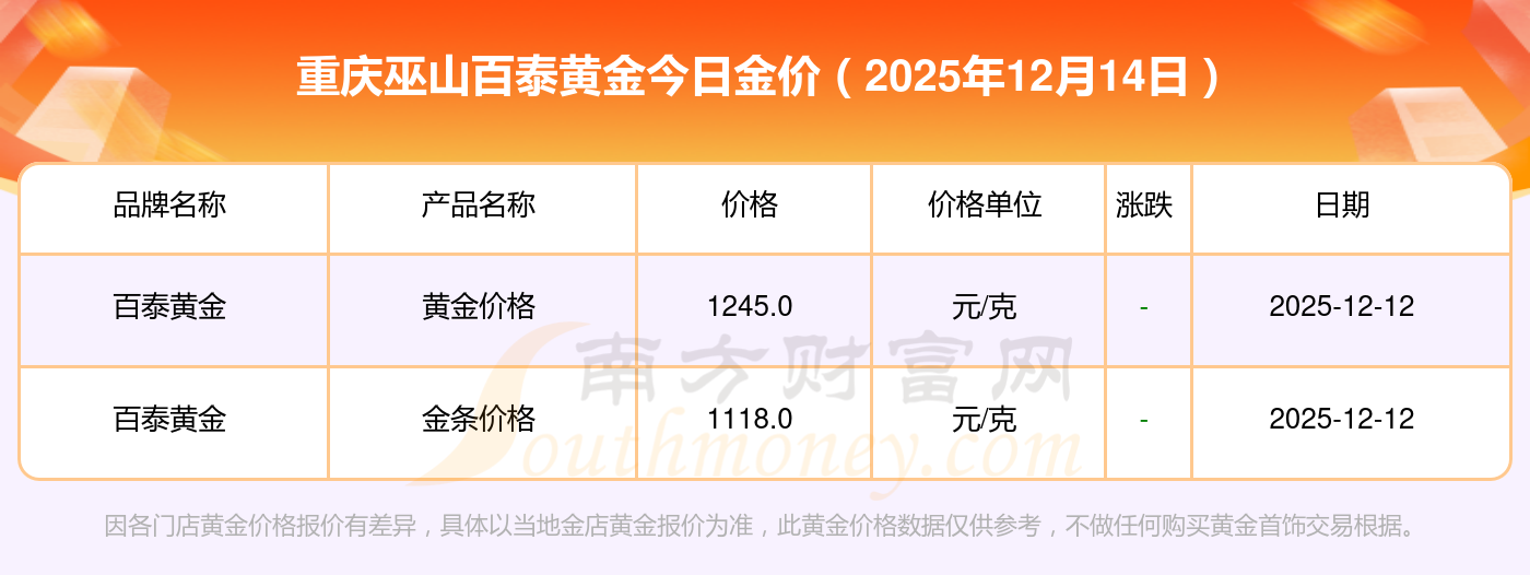 今天黄金价格几何?现在每克黄金值多少钱? 2025年12月14日重庆巫山百泰黄金黄金按克计价,现在多少钱一克?黄金价格1336.0元/克,铂金价格681.0元/克,黄金价格1337.0元/克,铂金价格650.0元/克,黄金价格1339.0元/克,铂金价格600.0元/克,黄金价格1338.0元/克,铂金价格681.0元/克,饰品金价(内地)1336.0元/克,黄金饰品(香港)47410.0,铂金价格(香港)19550.0。