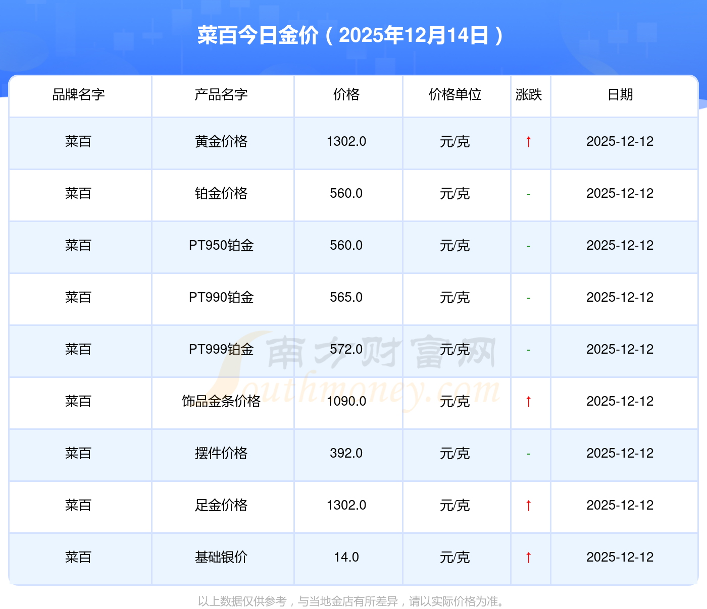 2025年12月14日菜百今日价格:黄金价格1336.0元/克,铂金价格681.0元/克,黄金价格1337.0元/克,铂金价格650.0元/克,黄金价格1339.0元/克,铂金价格600.0元/克,黄金价格1338.0元/克,铂金价格681.0元/克,饰品金价(内地)1336.0元/克,黄金饰品(香港)47410.0,铂金价格(香港)19550.0。