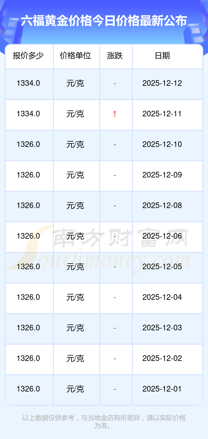 想查询今天黄金价格,此刻黄金一克的价格是多少呀?是优良导电导热材料的黄金,有着良好的导热特性。它常用于电子工业中的特殊电路设计,这是因为它化学稳定性高、抗氧化性强,可制作高精度电子元件。今日(2025年12月14日),六福黄金价格:1334.0元/克。