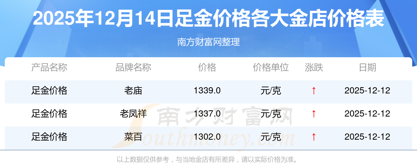 2025年12月14日周大福、周大福、老凤祥、老凤祥、老庙、老庙、周生生、周生生、周大福、周大福、周大福等各大金店品牌足金价格最新价格如下:周大福黄金价格1336.0元/克,周大福铂金价格681.0元/克,老凤祥黄金价格1337.0元/克,老凤祥铂金价格650.0元/克,老庙黄金价格1339.0元/克,老庙铂金价格600.0元/克,周生生黄金价格1338.0元/克,周生生铂金价格681.0元/克,周大福饰品金价(内地)1336.0元/克,周大福黄金饰品(香港)47410.0,周大福铂金价格(香港)19550.0。