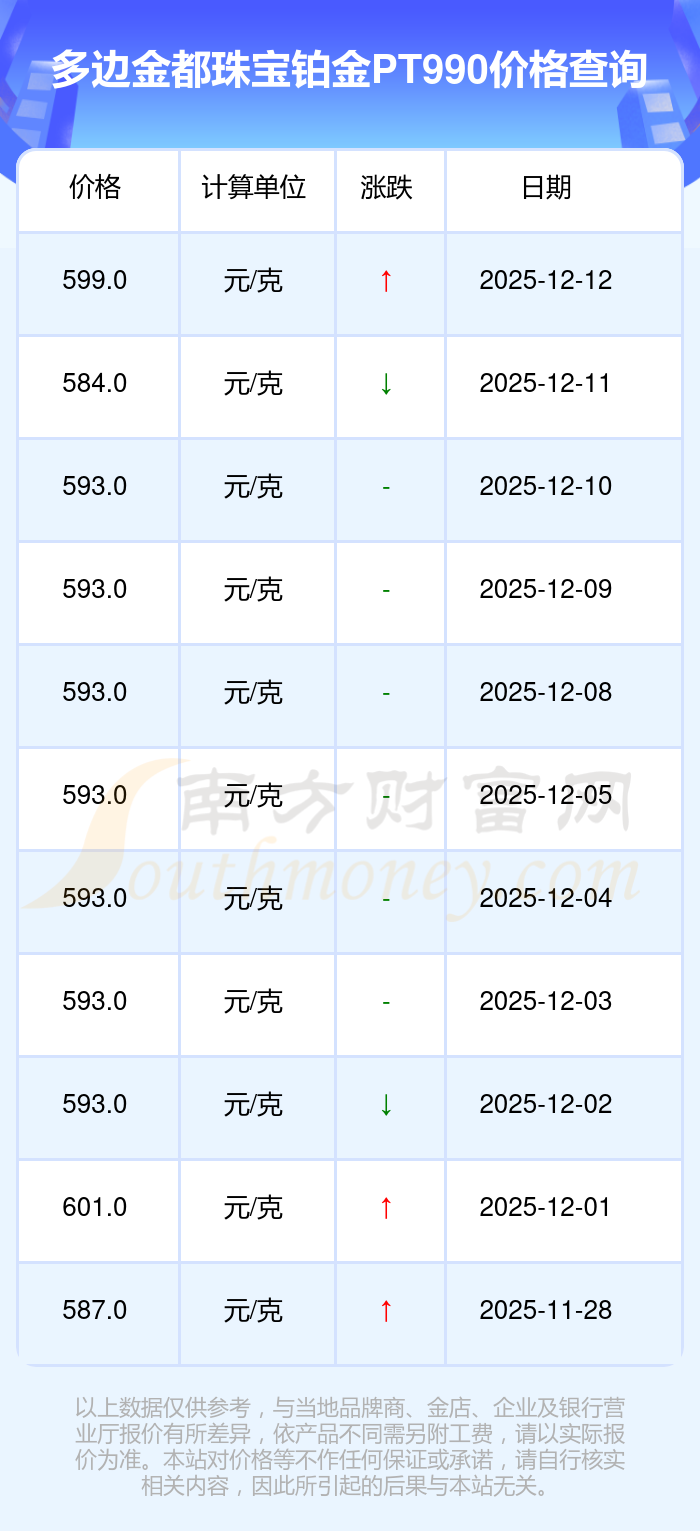 多边金都珠宝 铂金PT990价格在今日更新至599.0元/克。