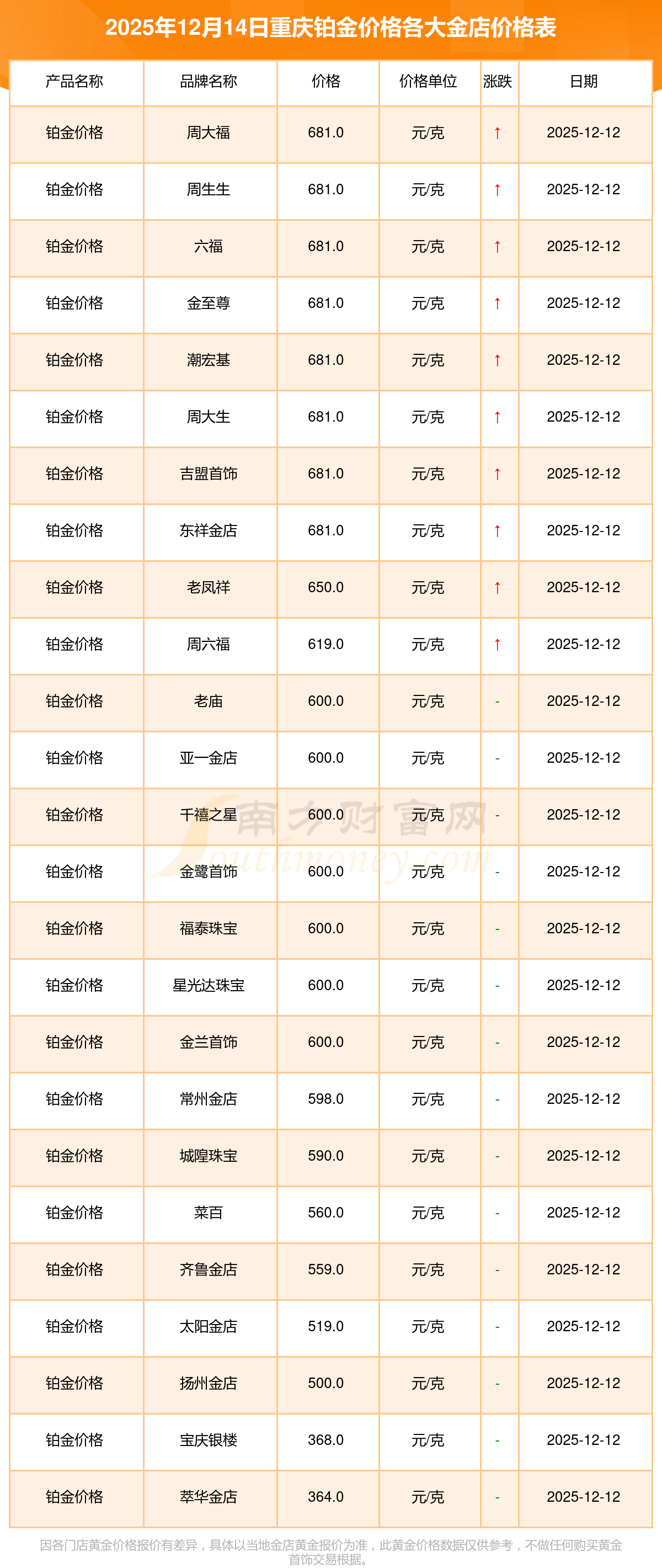 今天是2025年12月14日,重庆周大福、周大福、老凤祥、老凤祥、老庙、老庙、周生生、周生生、周大福、周大福、周大福等各大金店品牌铂金价格最新价格如下:周大福1336.0元/克、周大福681.0元/克、老凤祥1337.0元/克、老凤祥650.0元/克、老庙1339.0元/克、老庙600.0元/克、周生生1338.0元/克、周生生681.0元/克、周大福1336.0元/克、周大福47410.0、周大福19550.0。