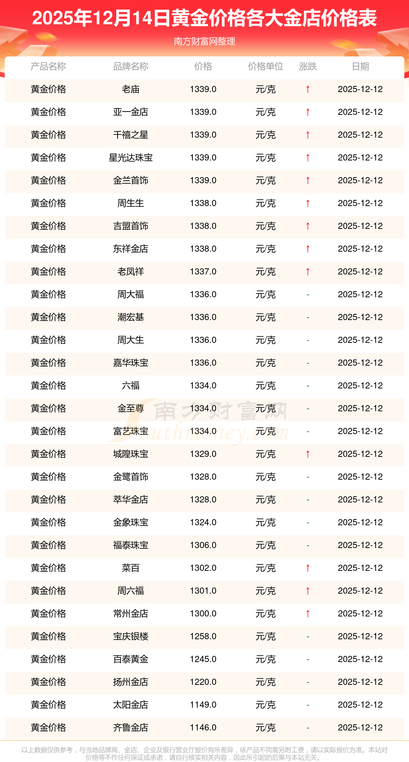 今天是2025年12月14日,周大福、周大福、老凤祥、老凤祥、老庙、老庙、周生生、周生生、周大福、周大福、周大福等各大金店品牌黄金价格最新价格如下:周大福1336.0元/克、周大福681.0元/克、老凤祥1337.0元/克、老凤祥650.0元/克、老庙1339.0元/克、老庙600.0元/克、周生生1338.0元/克、周生生681.0元/克、周大福1336.0元/克、周大福47410.0、周大福19550.0。
