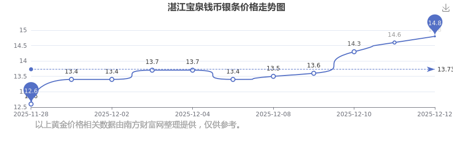 今日湛江宝泉钱币银条价格:14.8元/克。