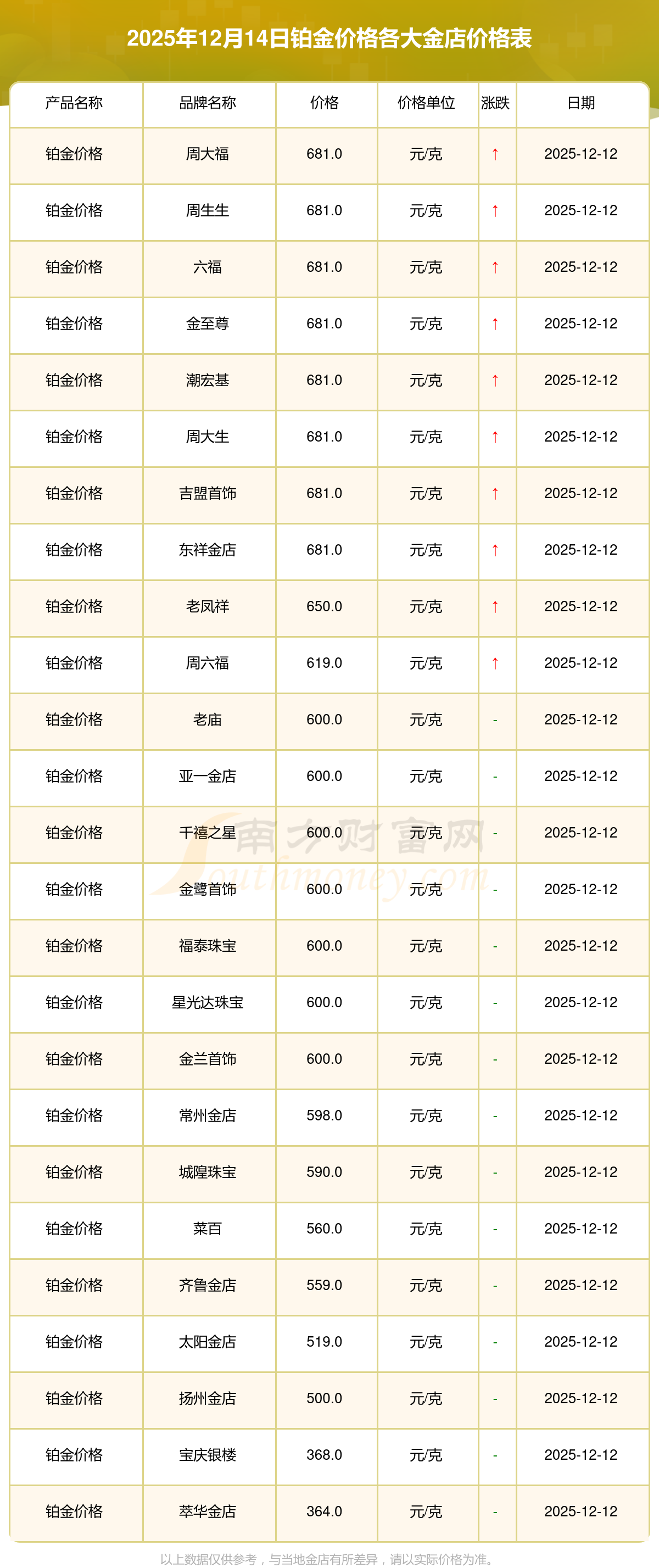 2025年12月14日各大金店铂金价格一克多少钱?各大金店铂金价格最新公布