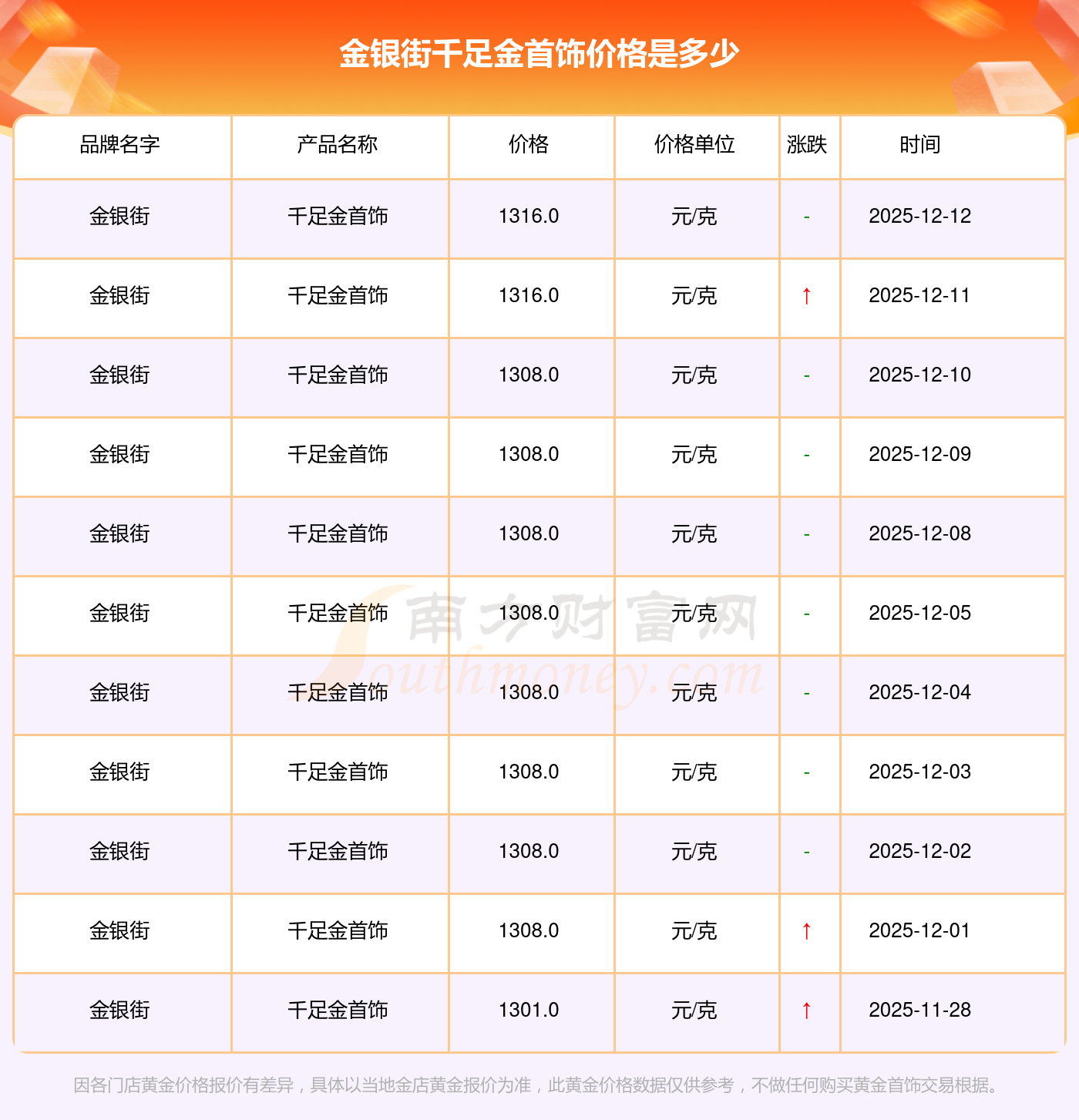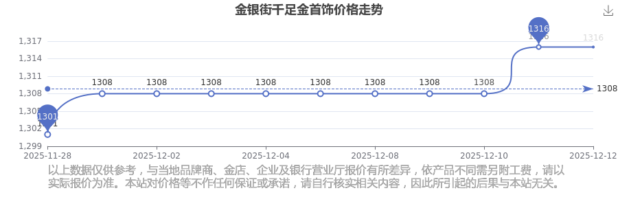 今日(2025年12月14日),金银街千足金首饰最新价格是1316.0元/克。
