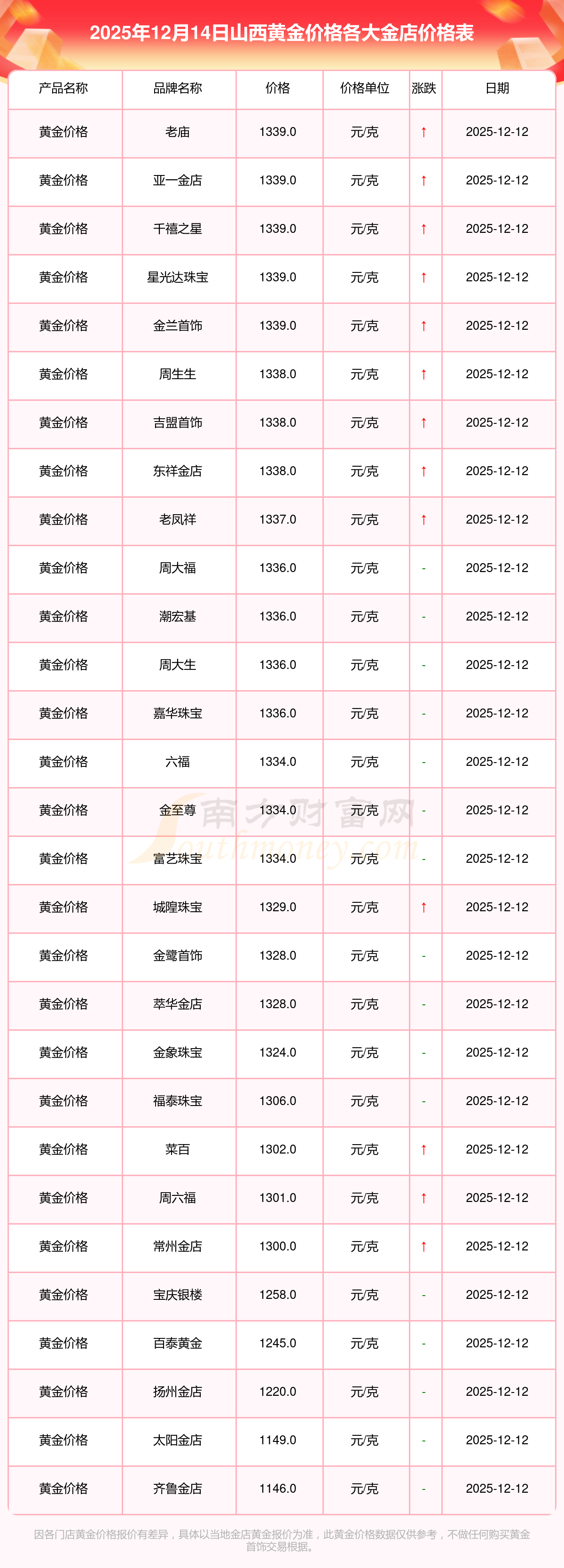 2025年12月14日山西周大福、周大福、老凤祥、老凤祥、老庙、老庙、周生生、周生生、周大福、周大福、周大福等各大金店品牌黄金价格最新价格行情来了,如下:周大福黄金价格1336.0元/克,周大福铂金价格681.0元/克,老凤祥黄金价格1337.0元/克,老凤祥铂金价格650.0元/克,老庙黄金价格1339.0元/克,老庙铂金价格600.0元/克,周生生黄金价格1338.0元/克,周生生铂金价格681.0元/克,周大福饰品金价(内地)1336.0元/克,周大福黄金饰品(香港)47410.0,周大福铂金价格(香港)19550.0。
