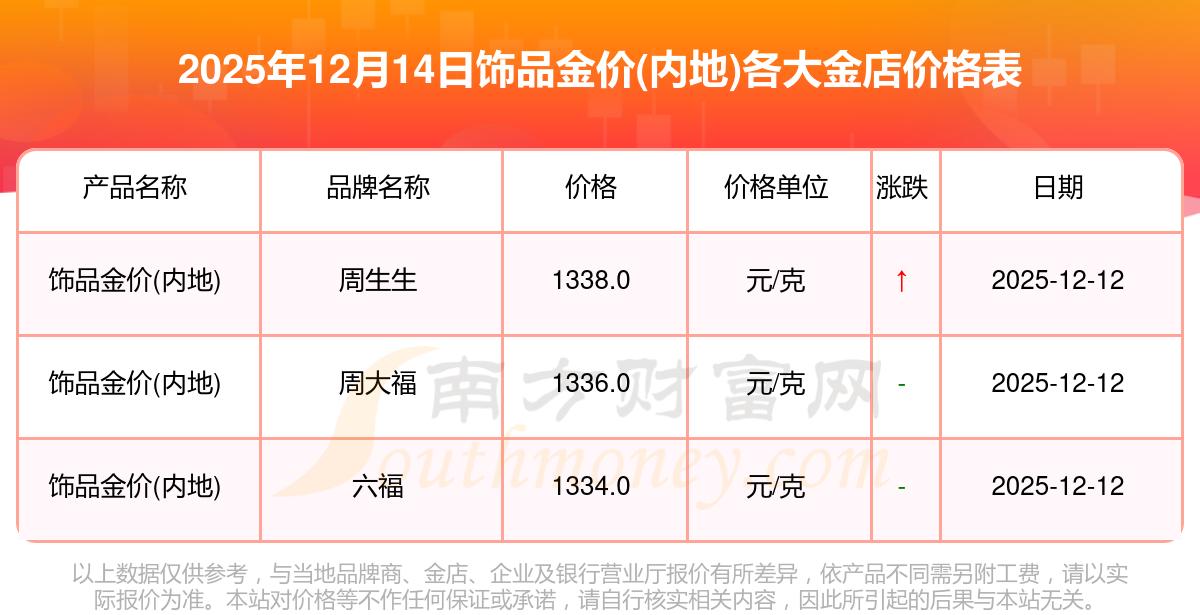 2025年12月14日周大福、周大福、老凤祥、老凤祥、老庙、老庙、周生生、周生生、周大福、周大福、周大福等各大金店品牌饰品金价(内地)最新价格如下:周大福黄金价格1336.0元/克,周大福铂金价格681.0元/克,老凤祥黄金价格1337.0元/克,老凤祥铂金价格650.0元/克,老庙黄金价格1339.0元/克,老庙铂金价格600.0元/克,周生生黄金价格1338.0元/克,周生生铂金价格681.0元/克,周大福饰品金价(内地)1336.0元/克,周大福黄金饰品(香港)47410.0,周大福铂金价格(香港)19550.0。