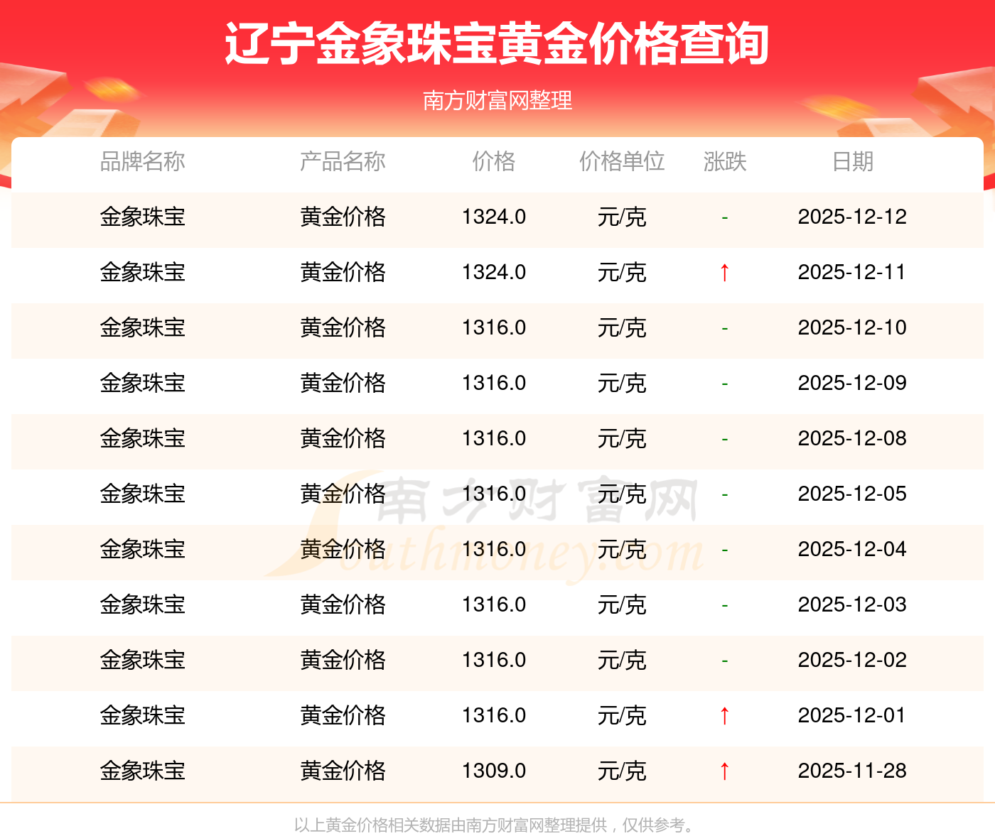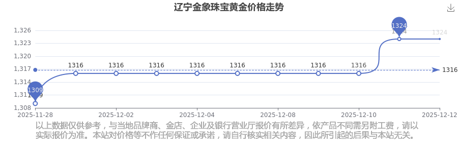 今日(2025年12月14日)辽宁金象珠宝黄金价格是1324.0元/克。