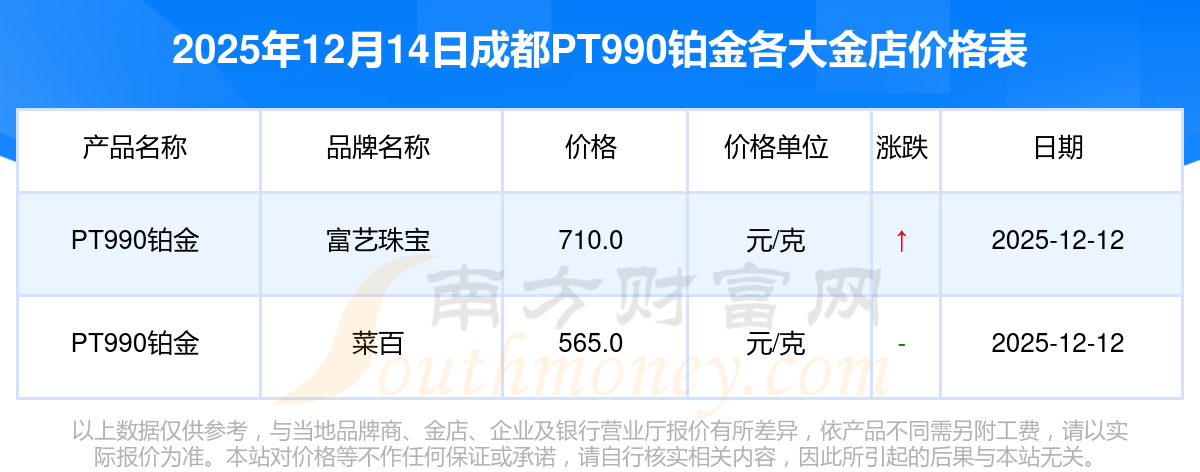 一、2025年成都PT990铂金今日价格最新汇总表,2025年12月14日成都各大金店PT990铂金价格是多少钱?