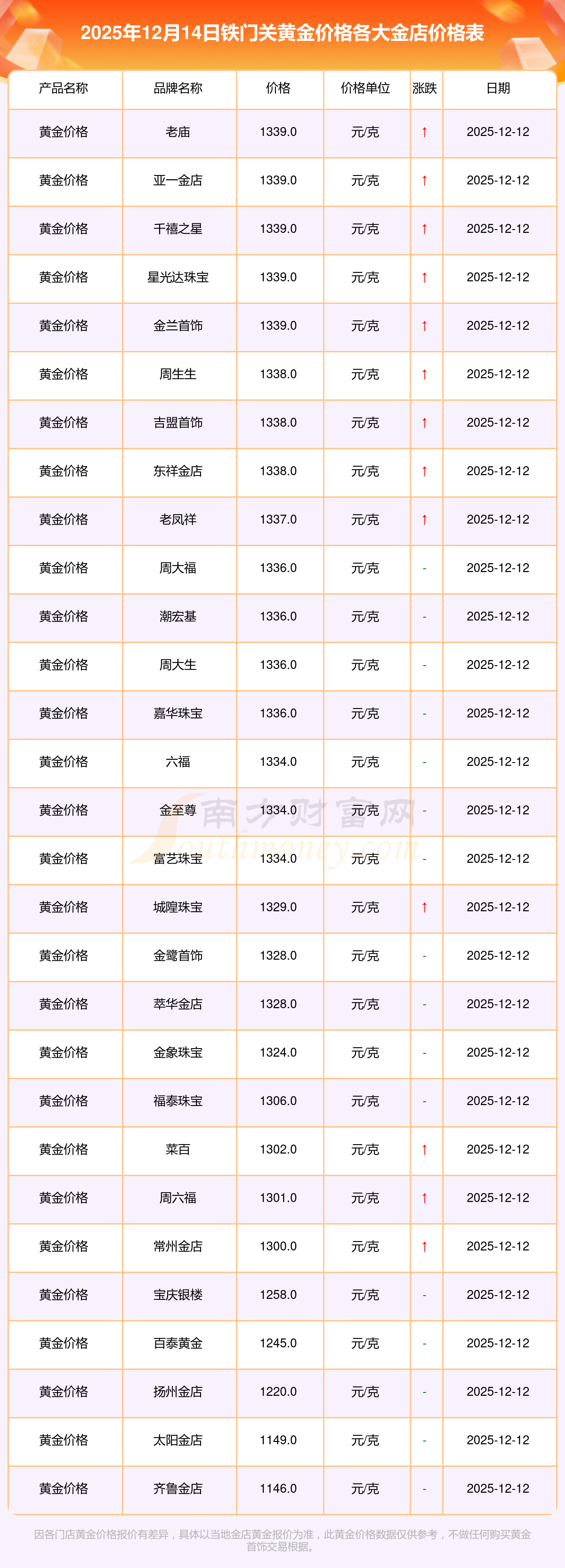 今天是2025年12月14日,铁门关周大福、周大福、老凤祥、老凤祥、老庙、老庙、周生生、周生生、周大福、周大福、周大福等各大金店品牌黄金价格最新价格行情是这样的:周大福1336.0元/克、周大福681.0元/克、老凤祥1337.0元/克、老凤祥650.0元/克、老庙1339.0元/克、老庙600.0元/克、周生生1338.0元/克、周生生681.0元/克、周大福1336.0元/克、周大福47410.0、周大福19550.0。