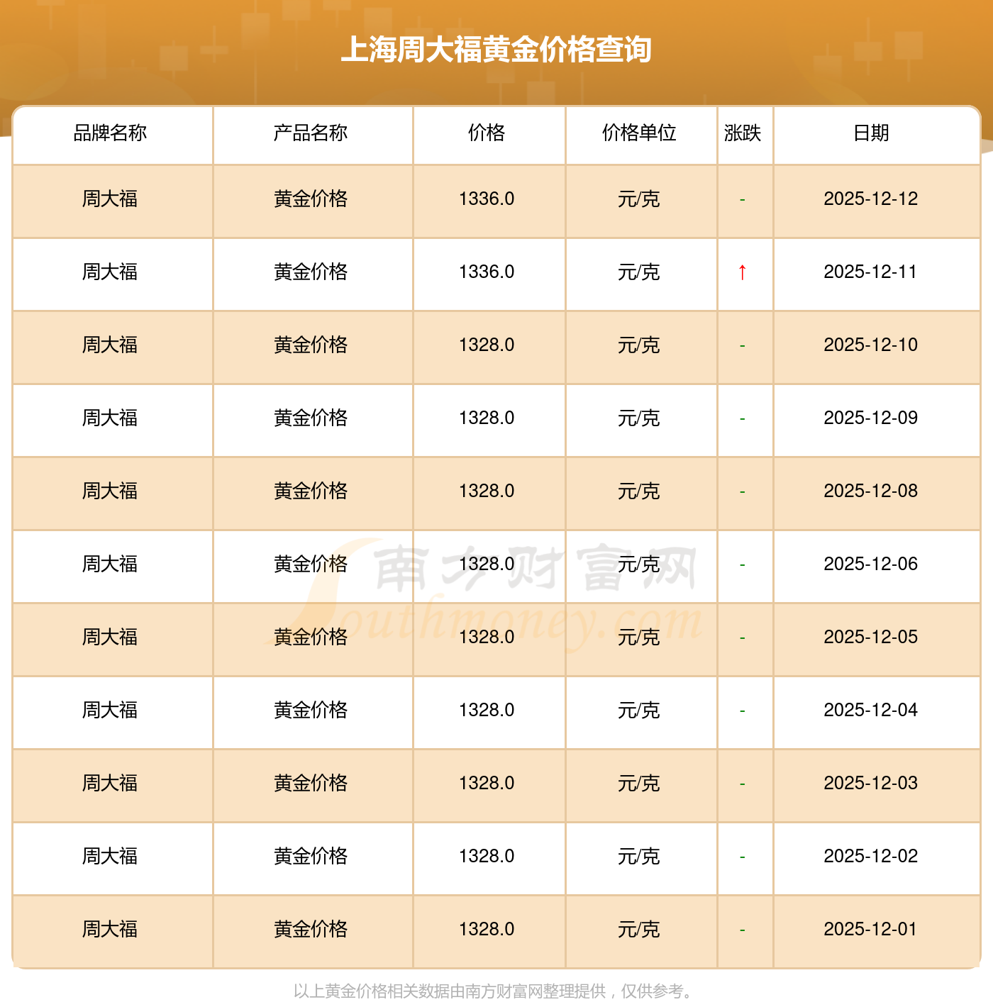 今日(2025年12月14日)上海周大福黄金价格是1336.0元/克。