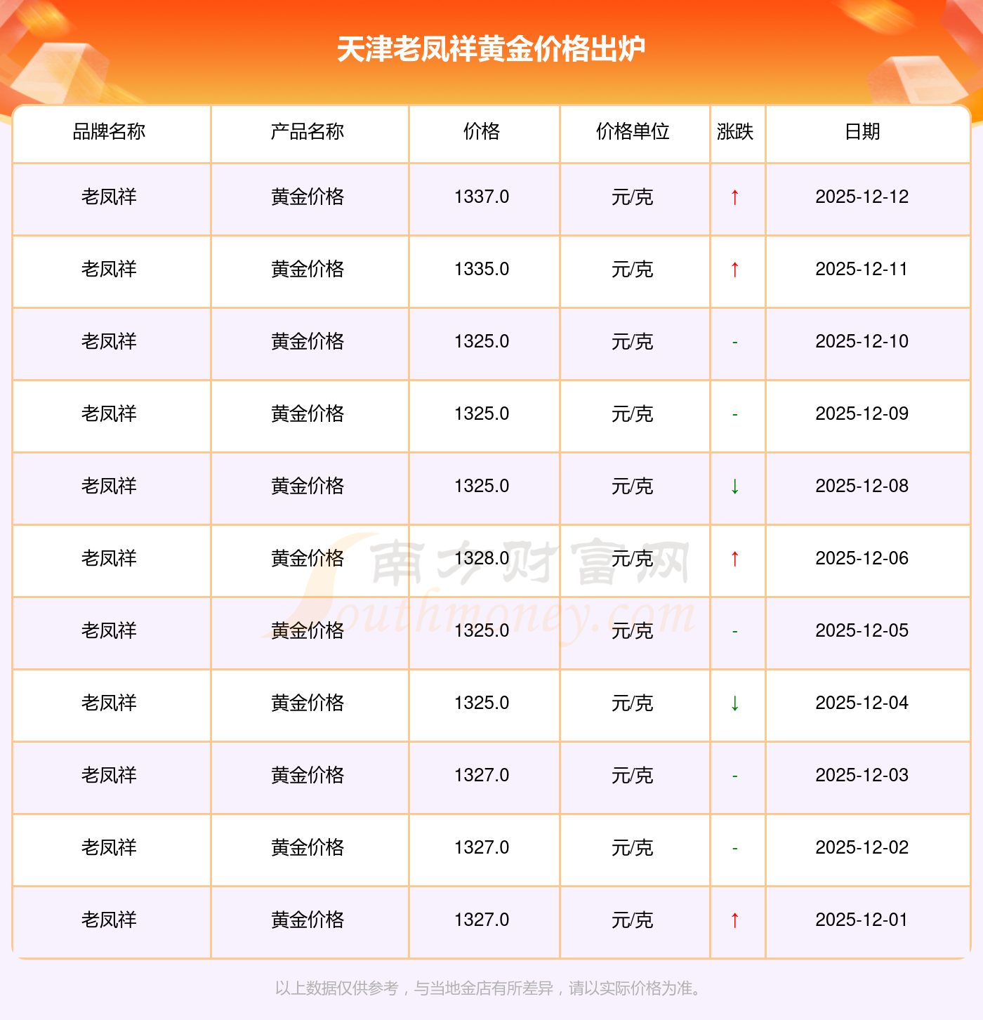 今日(2025年12月14日)天津老凤祥黄金价格最新价格为1337.0元/克。