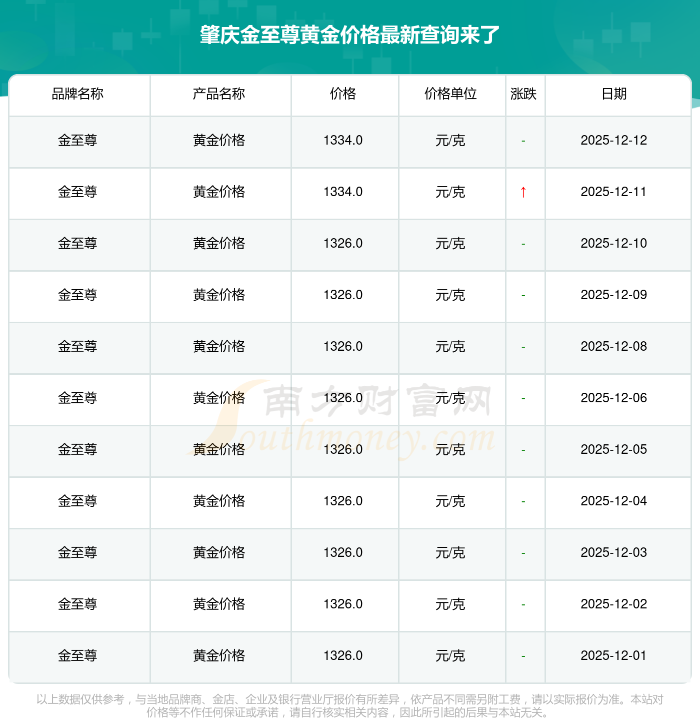 1334.0元/克的黄金价格,是肇庆金至尊在 2025年12月14日给出的。