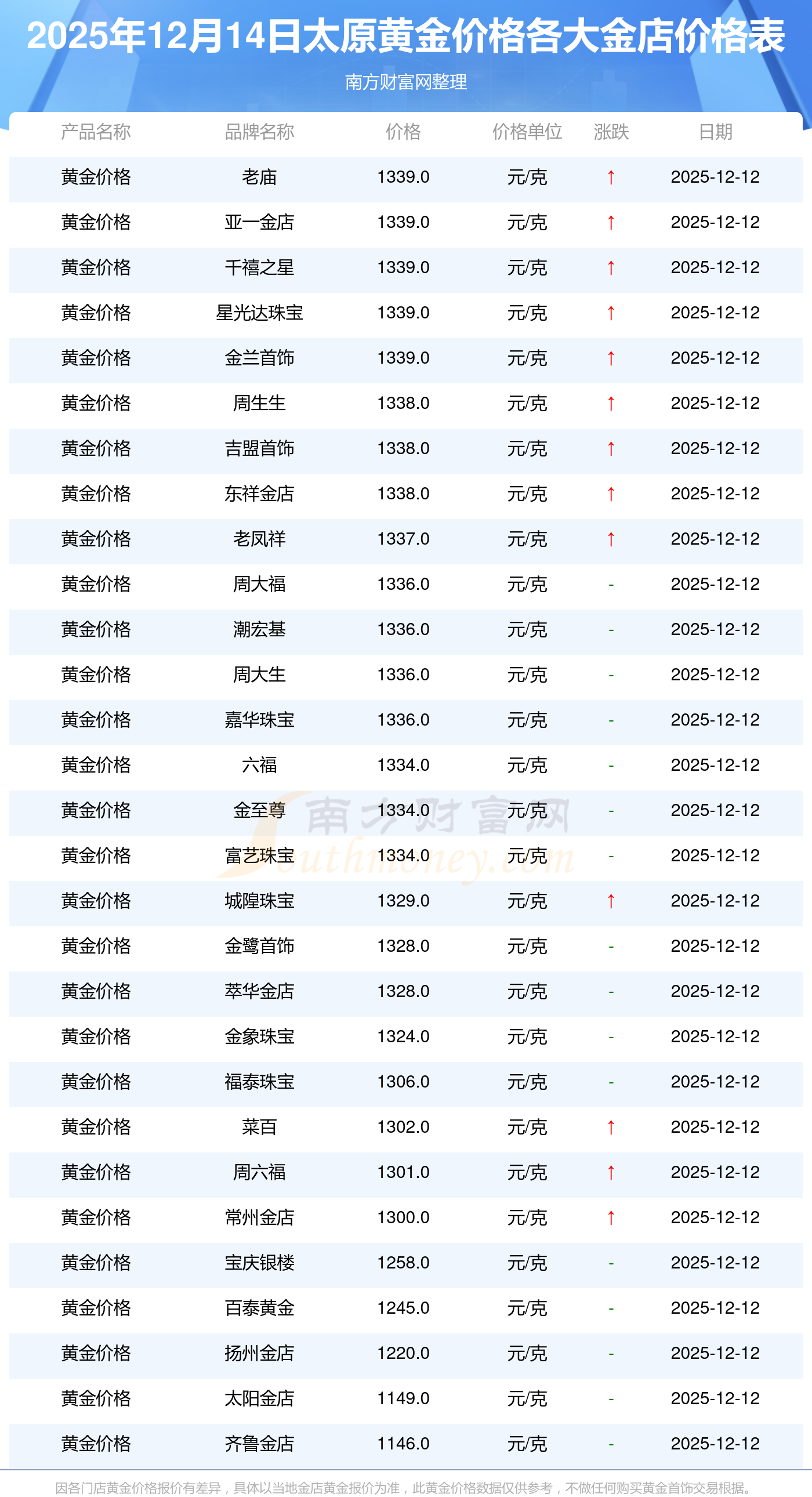 2025年12月14日太原周大福、周大福、老凤祥、老凤祥、老庙、老庙、周生生、周生生、周大福、周大福、周大福等各大金店品牌黄金价格最新价格如下:周大福黄金价格1336.0元/克,周大福铂金价格681.0元/克,老凤祥黄金价格1337.0元/克,老凤祥铂金价格650.0元/克,老庙黄金价格1339.0元/克,老庙铂金价格600.0元/克,周生生黄金价格1338.0元/克,周生生铂金价格681.0元/克,周大福饰品金价(内地)1336.0元/克,周大福黄金饰品(香港)47410.0,周大福铂金价格(香港)19550.0。