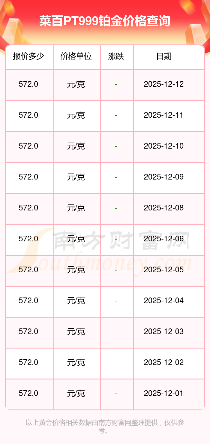 今日菜百 PT999铂金价格,最新确定为572.0元/克。
