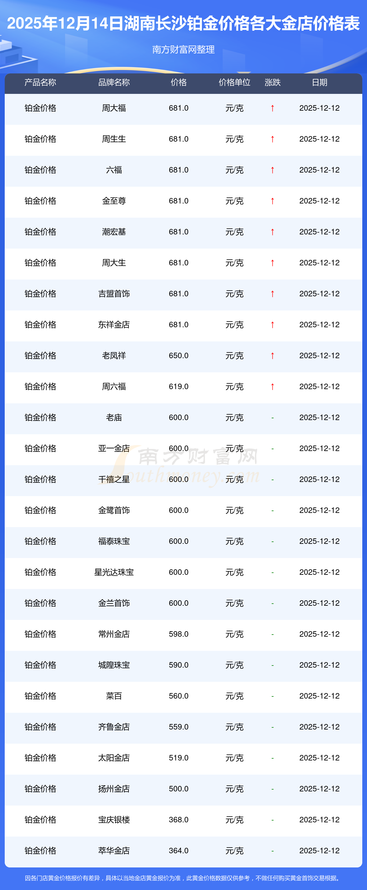 总之,今日湖南长沙铂金价格最高的金店是周大福,报价681.0元/克,铂金价格最低的金店是萃华金店,报价364.0元/克。今日铂金价格高低差为317元/克。