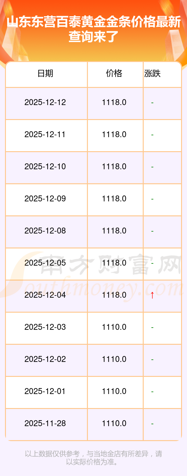 目前,金条价格报价区间在1196.0元/克和1118.0元/克之间。最高的为周六福,报价1196.0元/克,最低的为百泰黄金,报价1118.0元/克。今日金条价格高低差为78元/克。