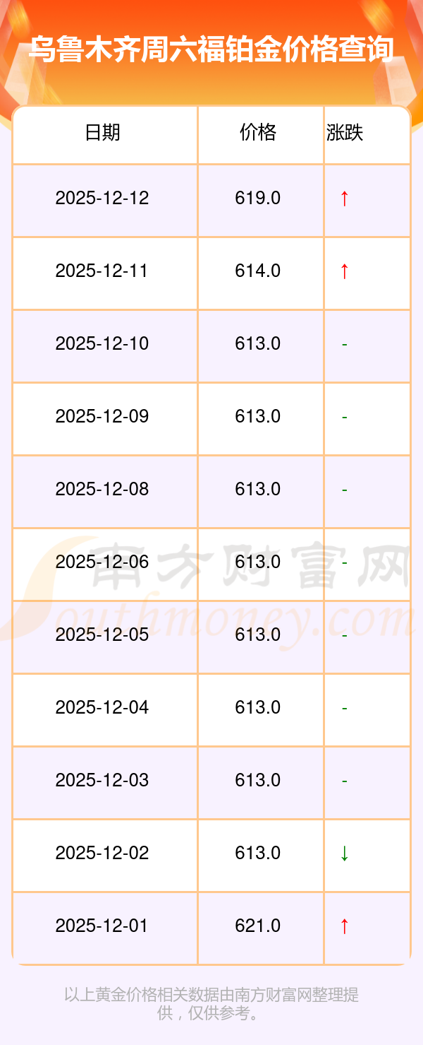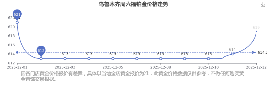 2025年12月14日乌鲁木齐周六福铂金价格是619.0元/克。