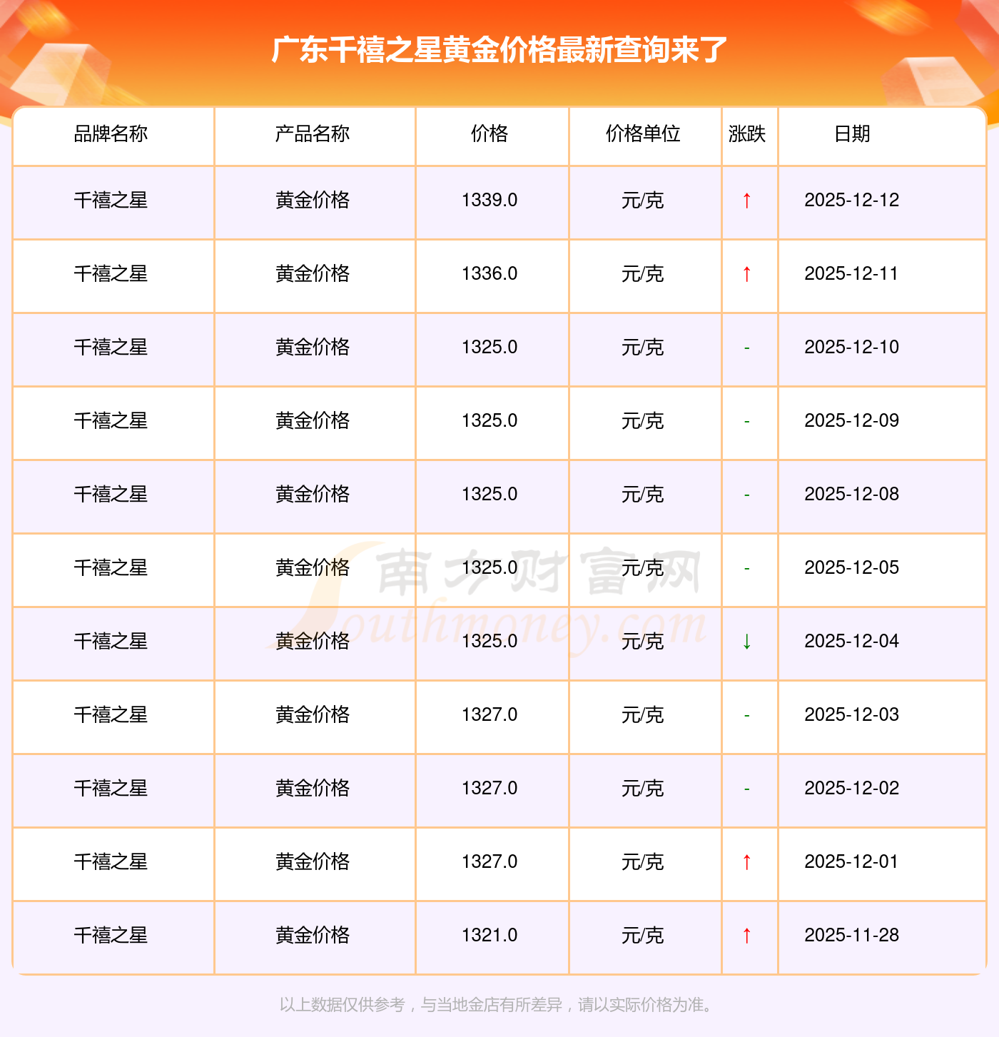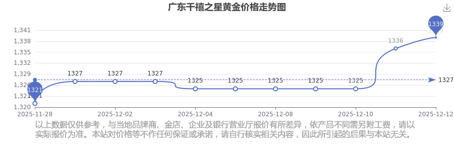 (2025年12月14日)广东千禧之星黄金价格现在为1339.0元/克。