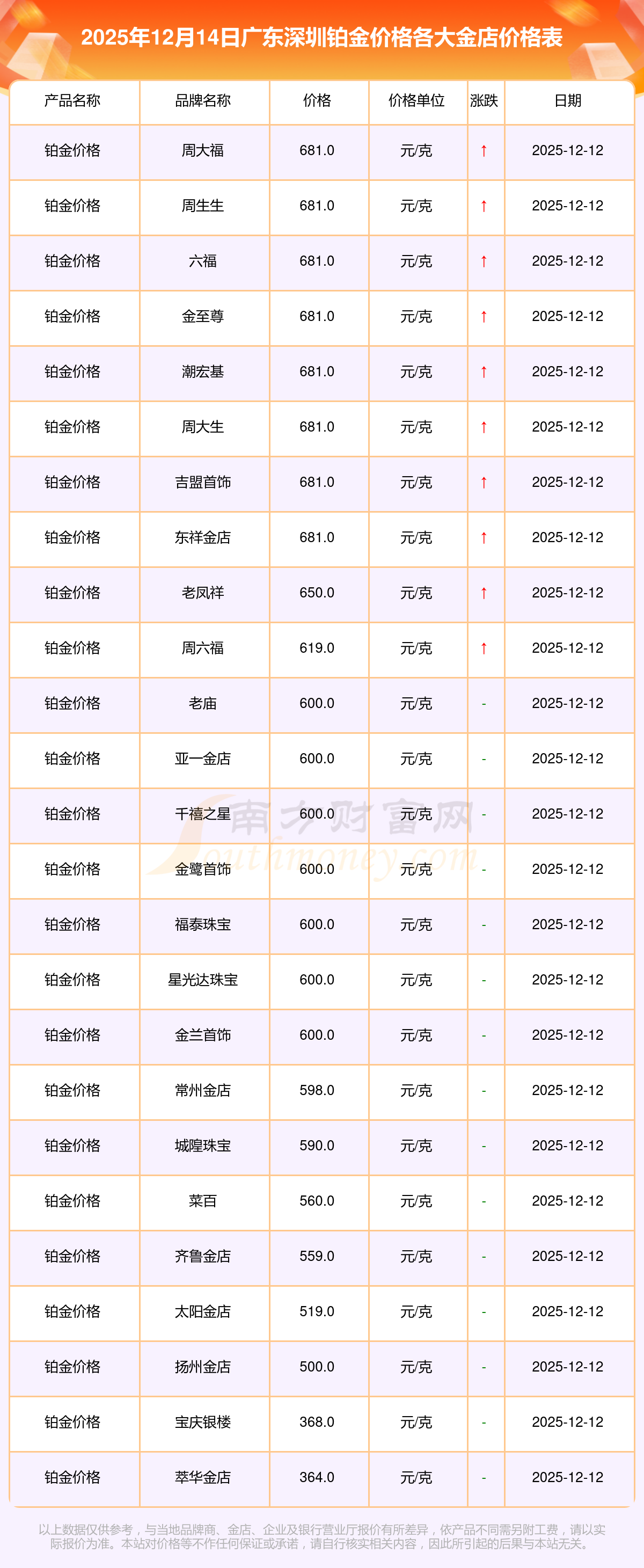 广东深圳各大金店铂金价格表来了-2025年12月14日广东深圳各大金店铂金价格多少钱一克?