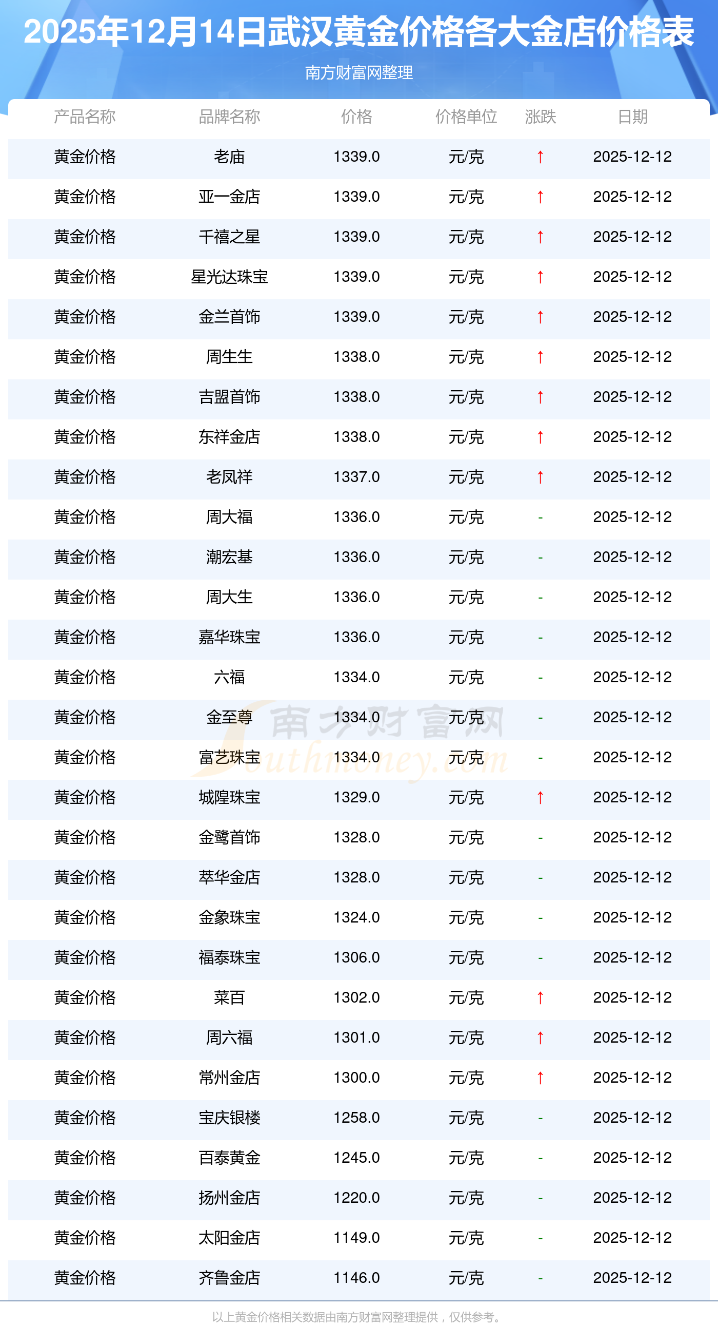 2025年12月14日武汉各大金店黄金价格最新价格:周大福1336.0元/克,周大福681.0元/克,老凤祥1337.0元/克,老凤祥650.0元/克,老庙1339.0元/克,老庙600.0元/克,周生生1338.0元/克,周生生681.0元/克,周大福1336.0元/克,周大福47410.0,周大福19550.0。