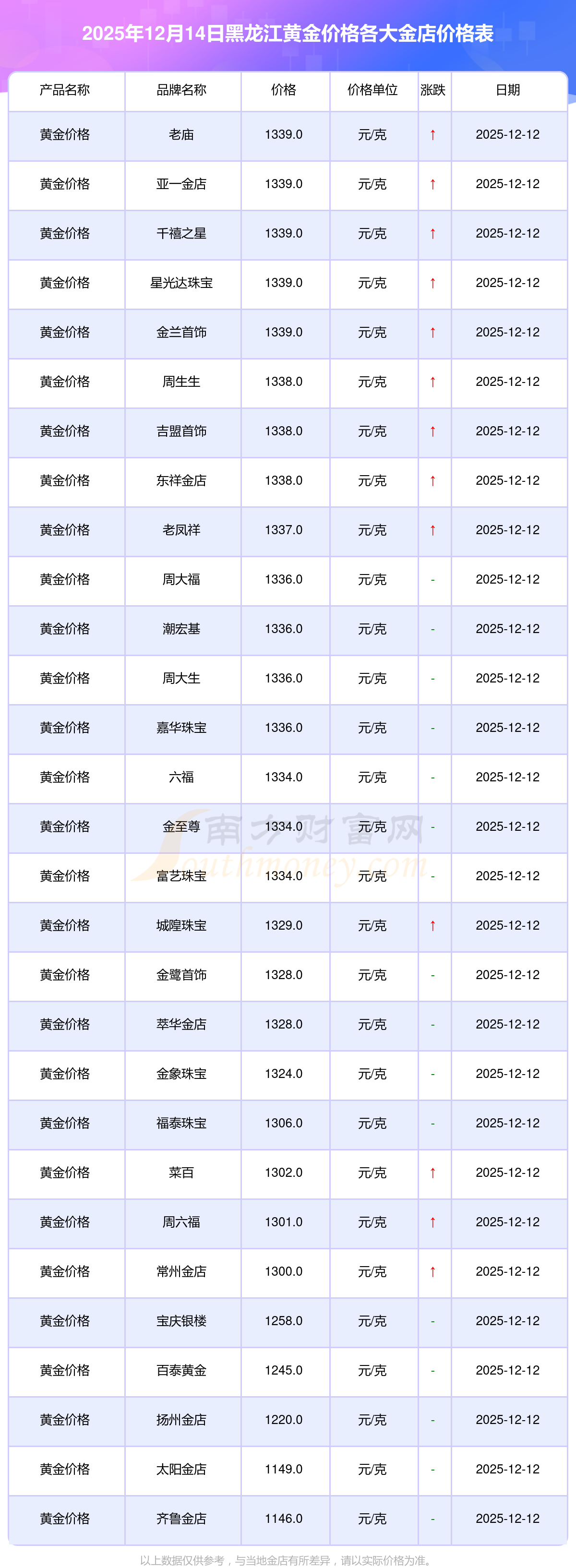 今天是2025年12月14日,黑龙江周大福、周大福、老凤祥、老凤祥、老庙、老庙、周生生、周生生、周大福、周大福、周大福等各大金店品牌黄金价格最新价格如下:周大福1336.0元/克、周大福681.0元/克、老凤祥1337.0元/克、老凤祥650.0元/克、老庙1339.0元/克、老庙600.0元/克、周生生1338.0元/克、周生生681.0元/克、周大福1336.0元/克、周大福47410.0、周大福19550.0。
