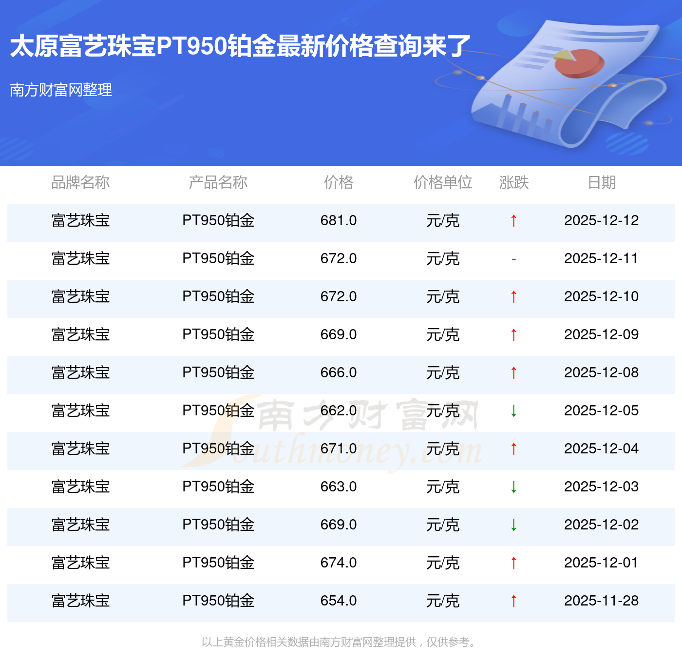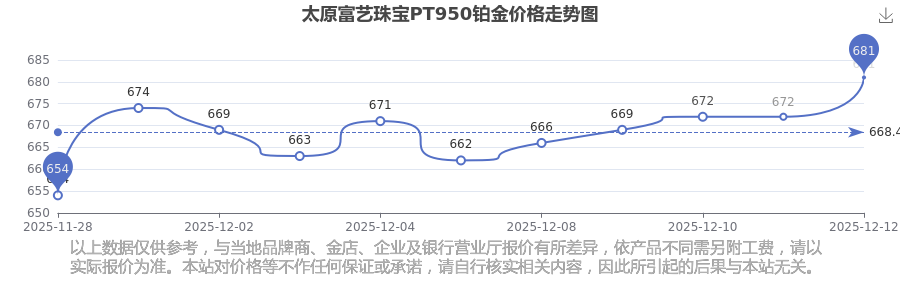 2025年12月14日当天,太原富艺珠宝PT950铂金的单价是 681.0元/克。