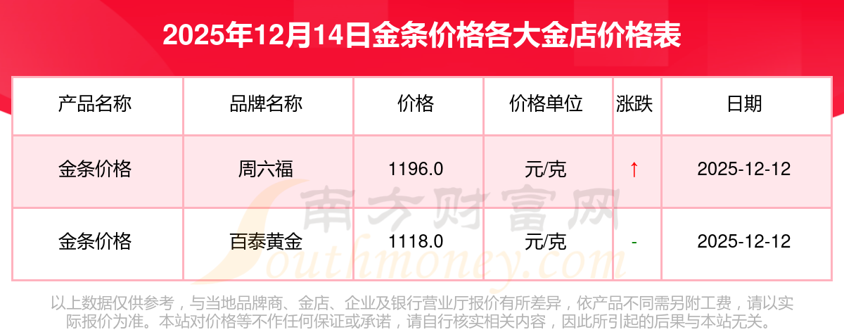 今天是2025年12月14日,周大福、周大福、老凤祥、老凤祥、老庙、老庙、周生生、周生生、周大福、周大福、周大福等各大金店品牌金条价格最新价格如下:周大福1336.0元/克、周大福681.0元/克、老凤祥1337.0元/克、老凤祥650.0元/克、老庙1339.0元/克、老庙600.0元/克、周生生1338.0元/克、周生生681.0元/克、周大福1336.0元/克、周大福47410.0、周大福19550.0。