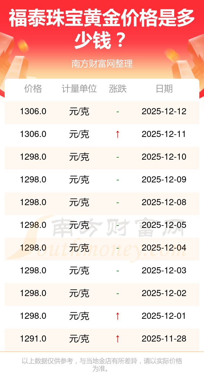 今日黄金价格查询_现在金价黄金一克多少钱,黄金价格是多少钱一克?作为一种优良的导电导热材料,黄金有良好的导热特性。因为化学稳定性高、抗氧化性强,可制作高精度电子元件,所以在电子工业的特殊电路设计中经常用到它。今日福泰珠宝黄金价格是1306.0元/克。