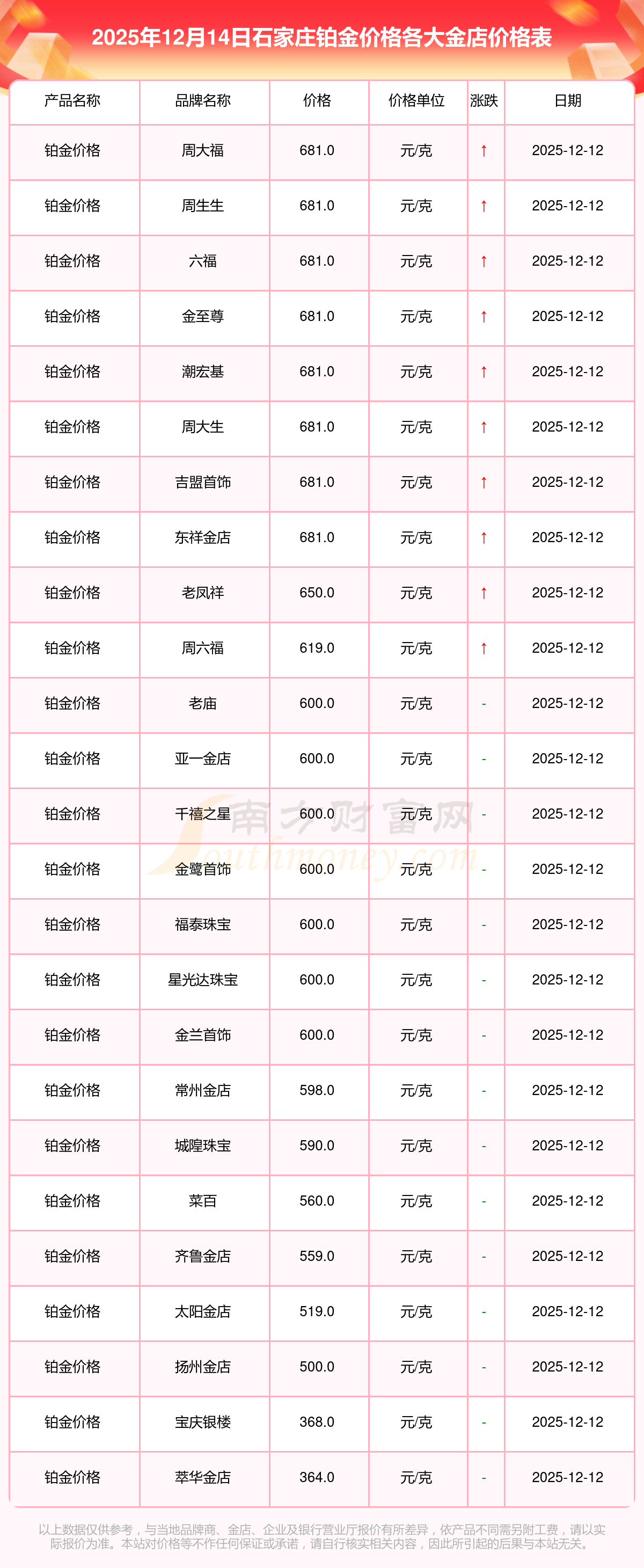 2025年12月14日石家庄各大金店铂金价格一克多少钱_金子价格今天价格查询
