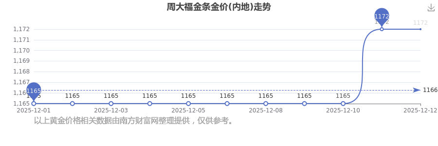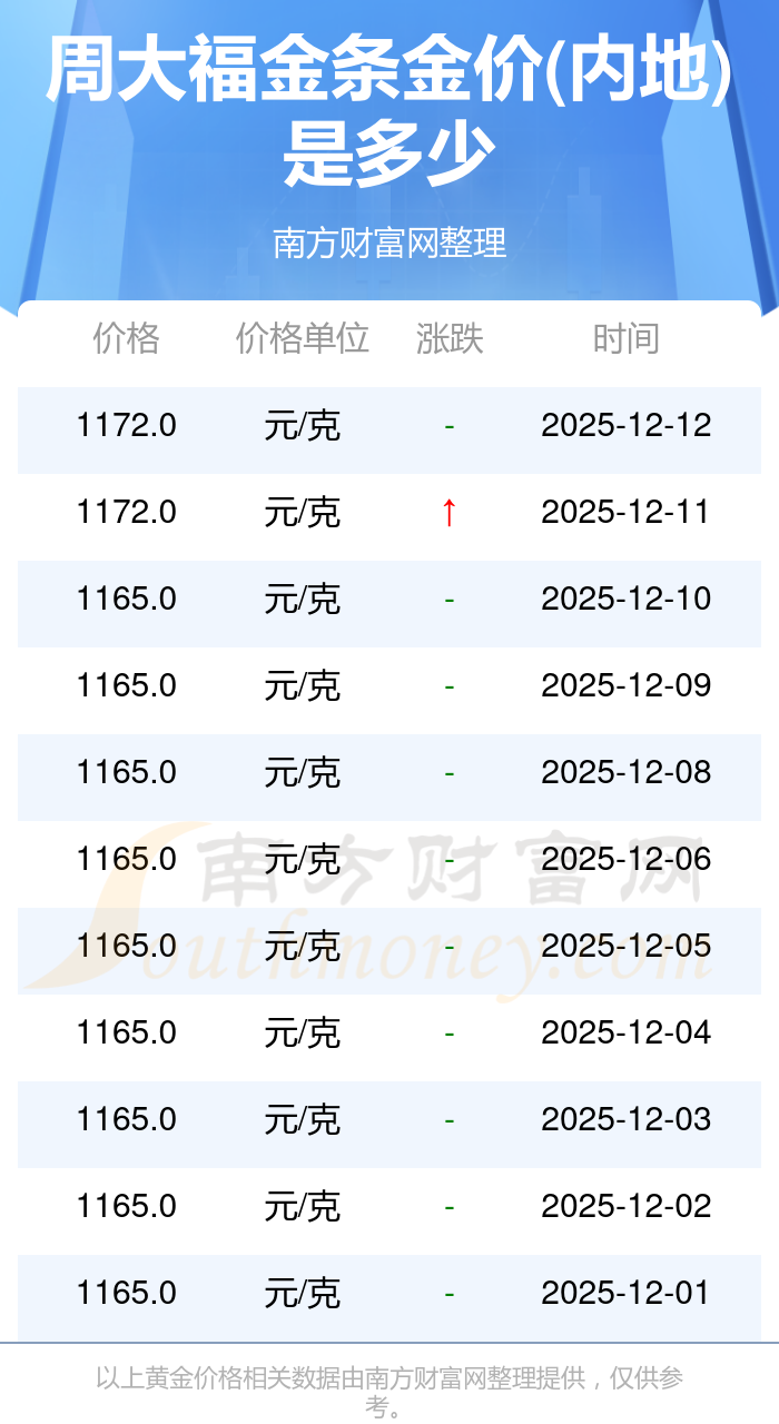 周大福 金条金价(内地)于今日的最新挂牌价为1172.0元/克。