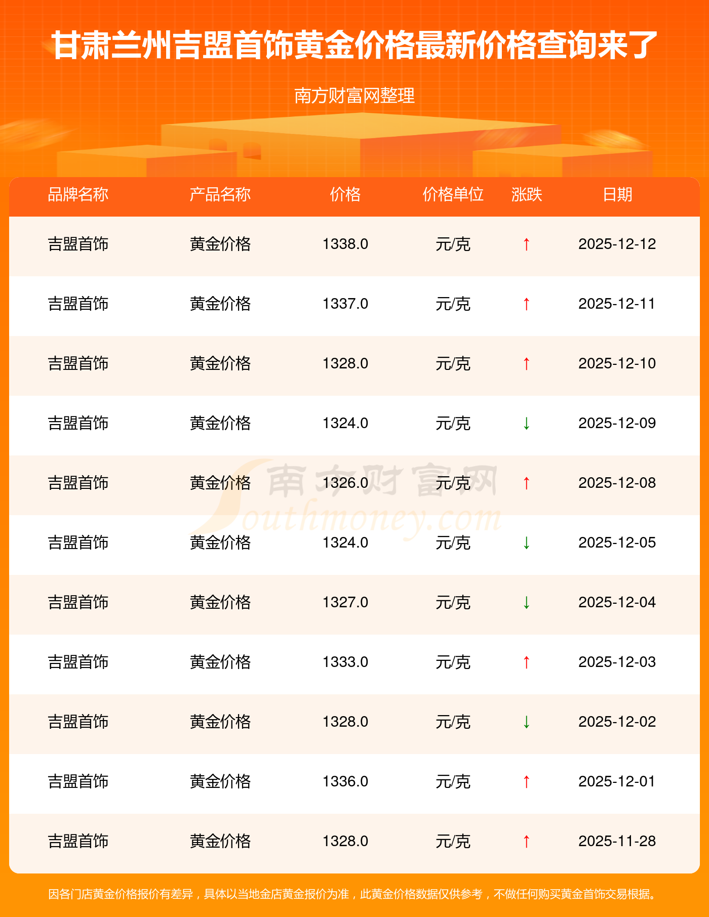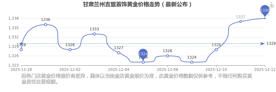 2025年12月14日当天,甘肃兰州吉盟首饰黄金价格的单价是 1338.0元/克。