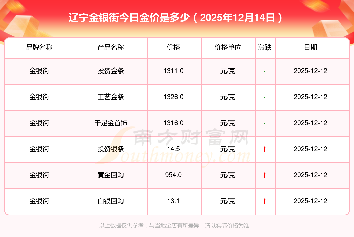 2025年12月14日辽宁金银街金价查询:黄金价格1336.0元/克,铂金价格681.0元/克,黄金价格1337.0元/克,铂金价格650.0元/克,黄金价格1339.0元/克,铂金价格600.0元/克,黄金价格1338.0元/克,铂金价格681.0元/克,饰品金价(内地)1336.0元/克,黄金饰品(香港)47410.0,铂金价格(香港)19550.0。