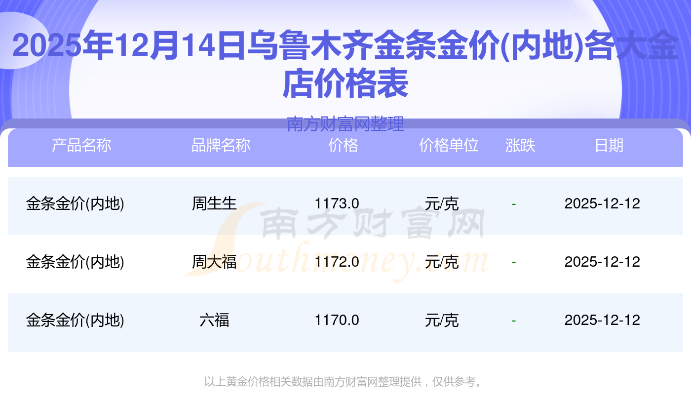 2025年12月14日,乌鲁木齐周大福、周大福、老凤祥、老凤祥、老庙、老庙、周生生、周生生、周大福、周大福、周大福等各大金店品牌金条金价(内地)今日价格如下:周大福1336.0元/克、周大福681.0元/克、老凤祥1337.0元/克、老凤祥650.0元/克、老庙1339.0元/克、老庙600.0元/克、周生生1338.0元/克、周生生681.0元/克、周大福1336.0元/克、周大福47410.0、周大福19550.0。