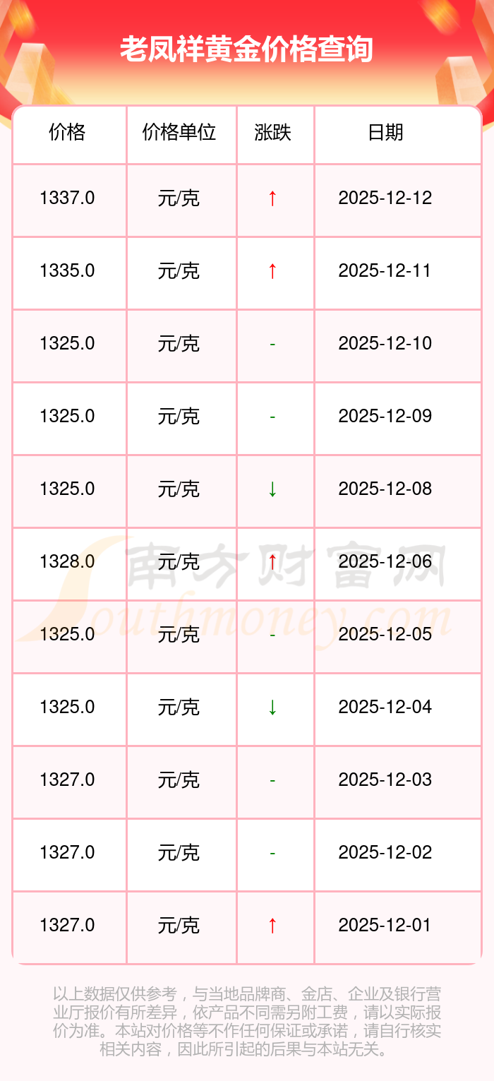 想查询今日黄金价格,当下黄金一克具体售价几何?黄金属于优良的导电导热材料,有着良好的导热特性。由于它化学稳定性高、抗氧化性强,能制作高精度电子元件,所以常被用于电子工业中的特殊电路设计。老凤祥 黄金价格在今日的最新价格显示为1337.0元/克。