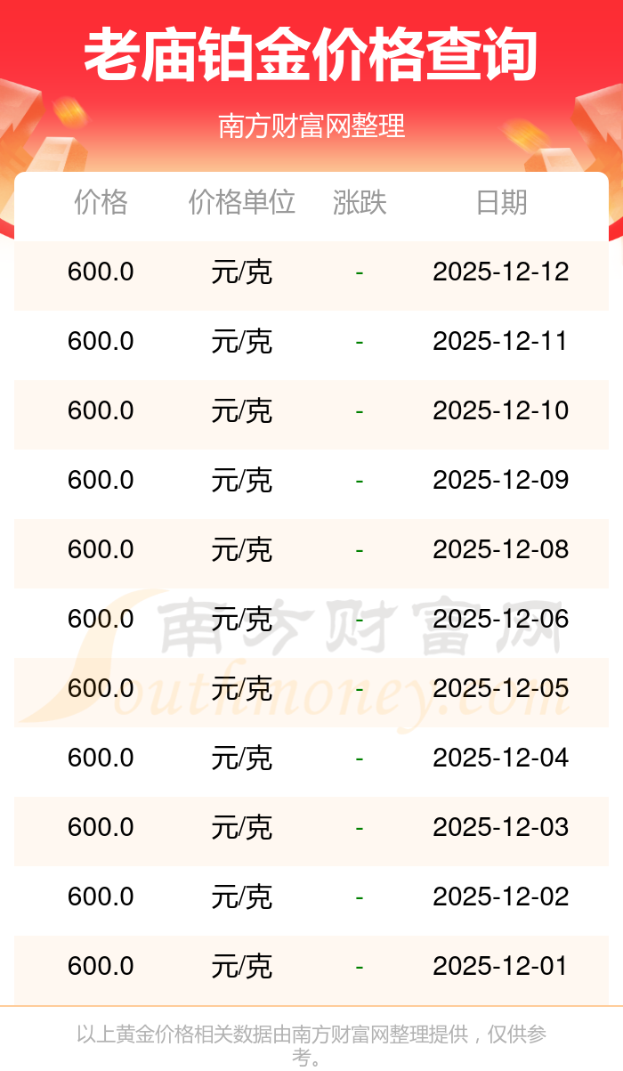 今日老庙铂金价格为600.0元/克。