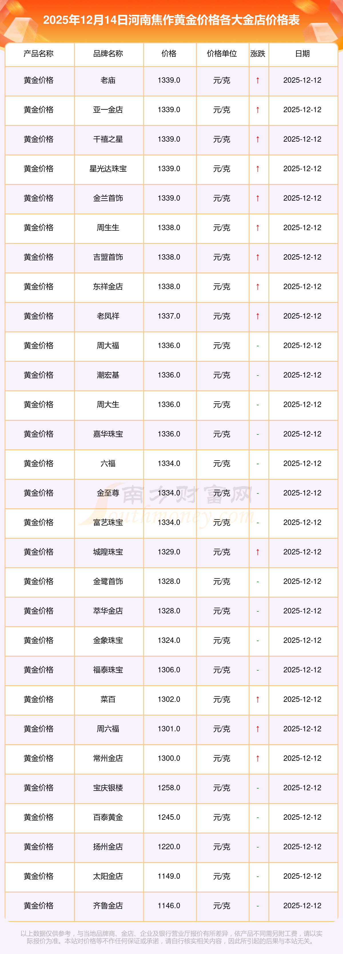 2025年12月14日河南焦作周大福、周大福、老凤祥、老凤祥、老庙、老庙、周生生、周生生、周大福、周大福、周大福等各大金店品牌黄金价格最新价格如下:周大福黄金价格1336.0元/克,周大福铂金价格681.0元/克,老凤祥黄金价格1337.0元/克,老凤祥铂金价格650.0元/克,老庙黄金价格1339.0元/克,老庙铂金价格600.0元/克,周生生黄金价格1338.0元/克,周生生铂金价格681.0元/克,周大福饰品金价(内地)1336.0元/克,周大福黄金饰品(香港)47410.0,周大福铂金价格(香港)19550.0。