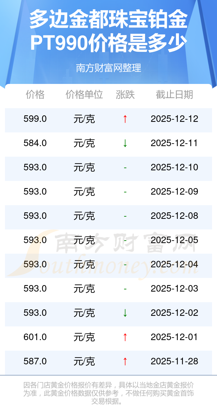 今日多边金都珠宝 铂金PT990最新的市场标价为599.0元/克。