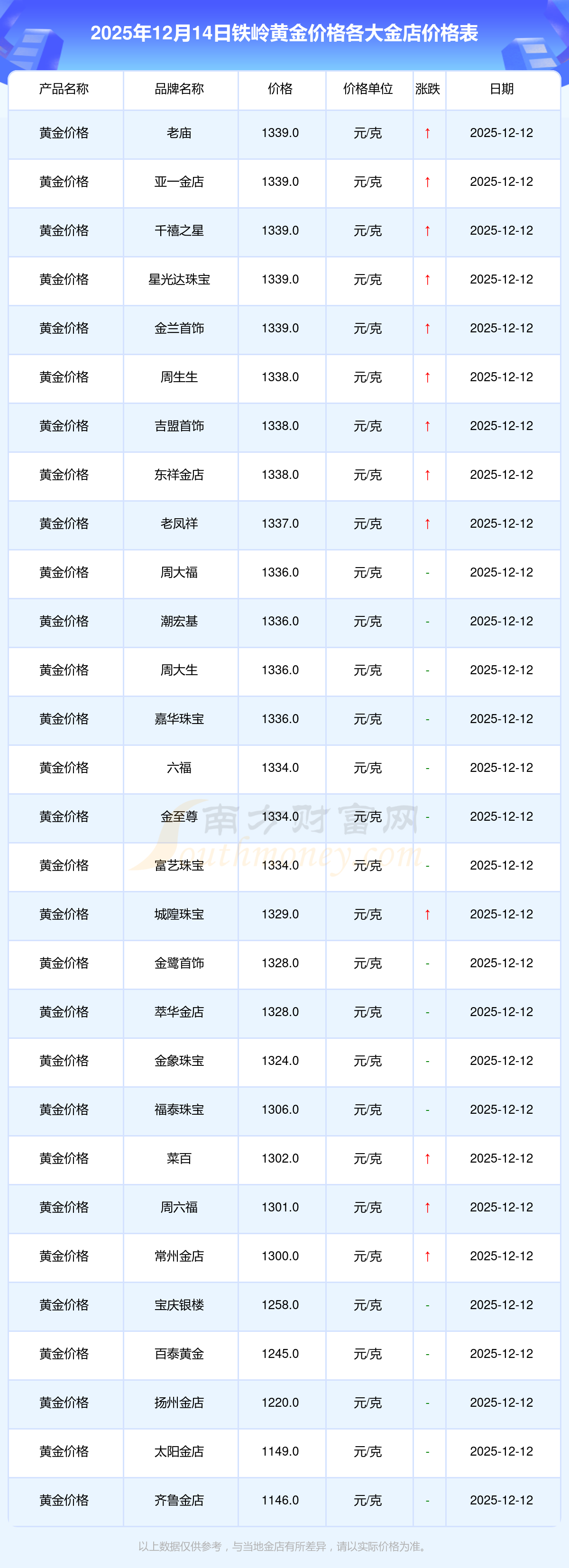 2025年12月14日,铁岭周大福、周大福、老凤祥、老凤祥、老庙、老庙、周生生、周生生、周大福、周大福、周大福等各大金店品牌黄金价格今日价格如下:周大福1336.0元/克、周大福681.0元/克、老凤祥1337.0元/克、老凤祥650.0元/克、老庙1339.0元/克、老庙600.0元/克、周生生1338.0元/克、周生生681.0元/克、周大福1336.0元/克、周大福47410.0、周大福19550.0。