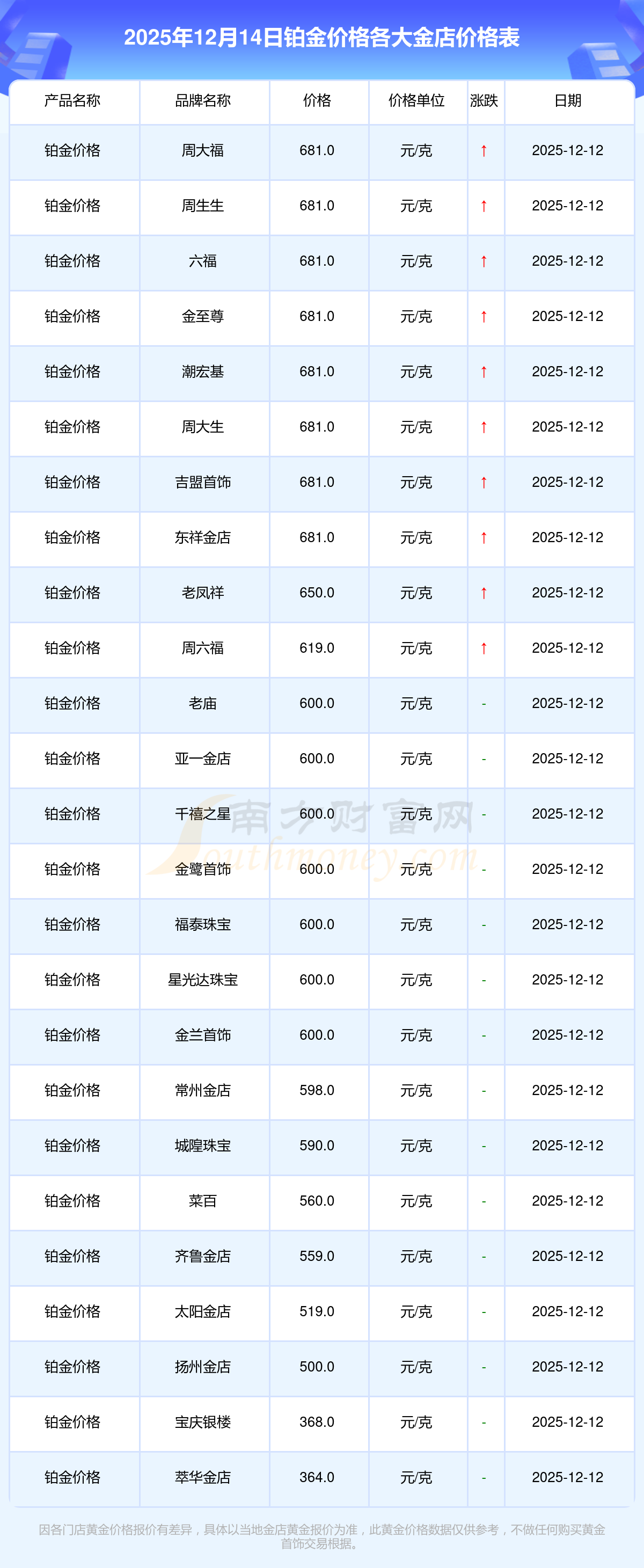 今日铂金价格报价最高的金店是周大福,为681.0元/克,报价最低的金店是萃华金店,为364.0元/克。今日铂金价格高低差为317元/克。