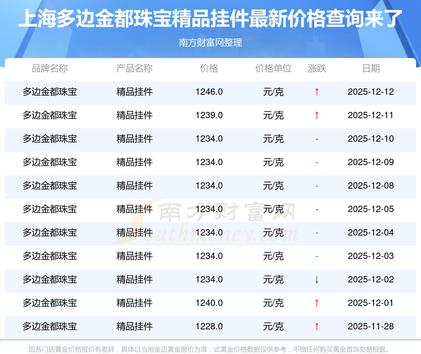 以上数据仅供参考,与当地品牌商、金店、企业及银行营业厅报价有所差异,依产品不同需另附工费,请以实际报价为准。本站对价格等不作任何保证或承诺,请自行核实相关内容,因此所引起的后果与本站无关。